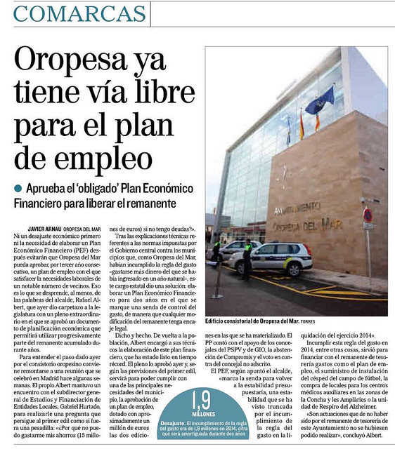El portaveu adjunt, Josep Lluís Romero, critica que: “El PP d’Orpesa utilitzés el Pla d’Ocupació Municipal per captar vots en les passades eleccions municipals (adjuntem programa del PP), celebrant un ple el 22 de maig (dos dies abans de les eleccions), amb l’excusa de l’aprovació d’un Pla Econòmic Financer. Va publicitar que tenia via lliure per fer un Pla d’Ocupació (adjunt nota de premsa del PP que es va publicar en un mitjà de comunicació). Un cop perduda la majoria absoluta, els populars han perdut l’interès pel Pla d’Ocupació i no ho han executat aquest any, amb mala intenció. Sabedors que el motiu de la pèrdua de la majoria del PP ha estat l’ús abusiu que feien del Pla d’Ocupació, que servia per anar endollant als seus simpatitzants, majoritàriament, i excloent als que simpatitzaven amb els partits de l’oposició ” .