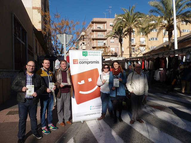 Membres de Compromís per Elx han estat durant este matí a la plaça de Madrid repartint informació sobre el procés de primàries que la formació posa en marxa per a configurar les llistes electorals municipals i autonòmiques de cara a les eleccions de 2015.