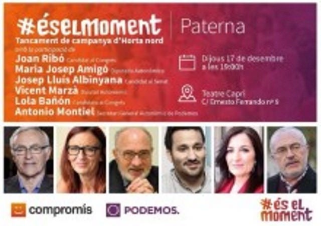 A l’acte assistiran primeres figures polítiques del País com ara, Vicent Marzà, conseller d’Educació i Cultura; Joan Ribó, Alcalde de València; Josep Lluís Albinyana, primer President del Consell Preautonòmic i candidat al Senat i Maria Josep Amigó, Vicepresidenta de la Diputació de València. També comptarà amb la presència del Secretari General de Podem al País Valèncià, Antonio Montiel i la candidata al Congrés, Lola Bañón.