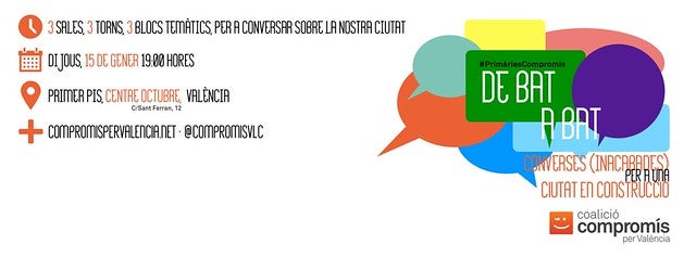Sota el nom “De Bat a Bat”, els candidats participaran en 3 debats simultanis que tindran lloc en 3 espais diferents de l’Octubre-Centre de Cultura Contemporània (C/Sant Ferran, 12), hui dijous, 15 de gener, a les 19h.