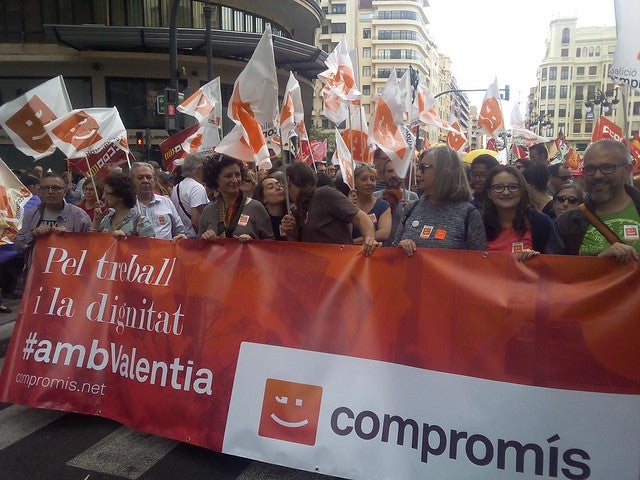 La candidata de Compromís a la Presidència de la Generalitat, Mónica Oltra,va participar ahir de la manifestació que ha recorregut el centre de València per commemorar el Dia Internacional dels Treballadors. Oltra s’ha referit a la situació alarmant que viuen els treballadors i treballadores “a qui se’ls dóna a triar entre patir l’atur o treballar amb contractes precaris i sous miserables”.
