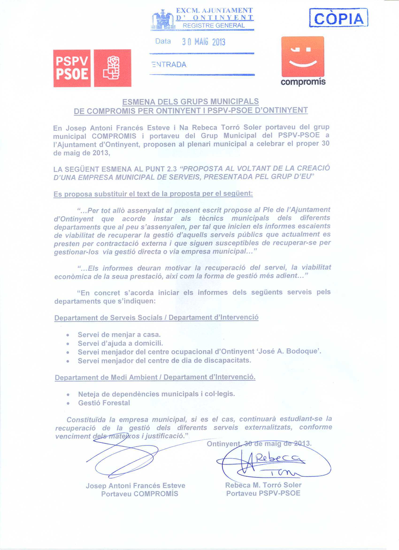 El Grup Municipal de COMPROMÍS PER ONTINYENT ha expressat públicament la seua voluntat de recolzar la creació d’una empresa pública a Ontinyent sempre que aquesta “aporte valor afegit i no més despesa”, i realitzant un pla de viabilitat “que ens permeta traure endavant una iniciativa com aquesta “amb serietat i el màxim rigor que la idea mereix”. Des de la coalició, el seu portaveu, Josep Francés, destacava al plenari que per tal de dur endavant aquesta empresa és necessari que aquesta “supose un clar benefici per a la societat, i aporte valor afegit en innovació, llocs de treball o millores en el servei, però en cap cas no supose un increment pressupostari del servei, ni per al ciutadà ni per a l’Ajuntament”.