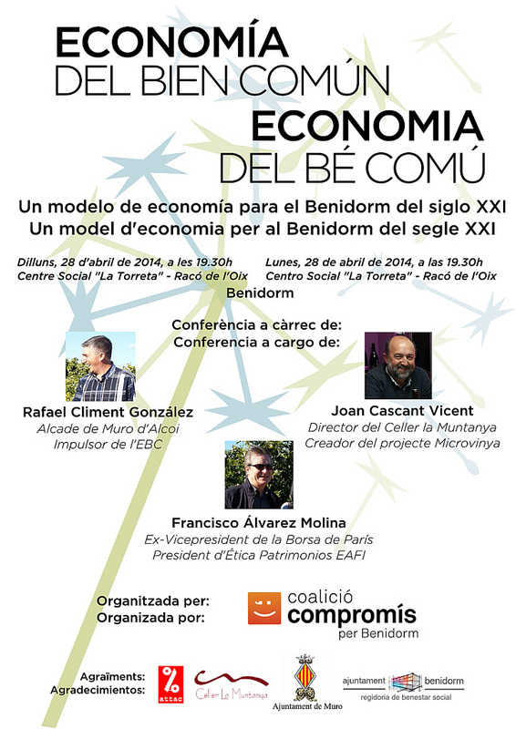 Rafael Climent, alcalde de Muro d’Alcoi, Francisco Álvarez, exvicepresident de la borsa de París, i Joan Cascant, director del Celler de la Muntanya, ens explicaran com es pot aplicar a Benidorm el model econòmic innovador que ja funciona a algunes regions alemanyes i austríaques: l’Economia del Bé Comú.