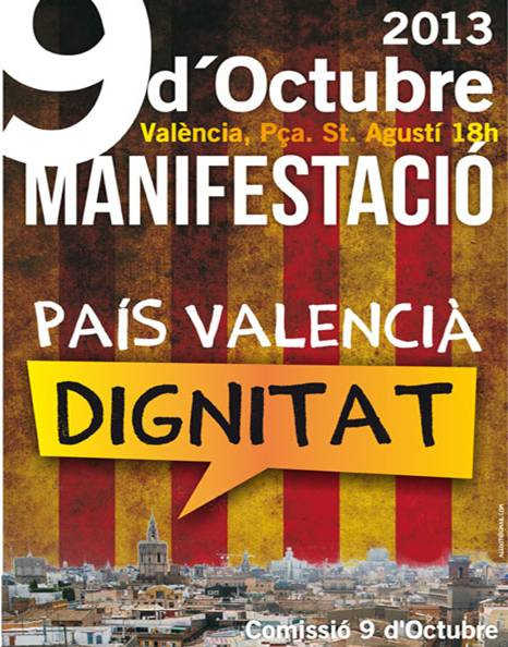 La Comissió 9 d’Octubre –formada per associacions, sindicats i partits, entre les quals Esquerra Unida- convoca un any més la tradicional manifestació de la diada del 9 d’Octubre que eixirà el dia 9 de la plaça de Sant Agustí de València a les 18h.