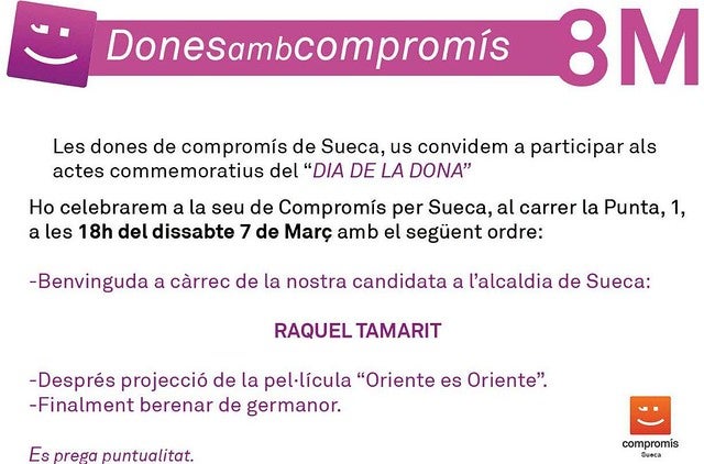 –Sueca: si esteu a prop de la Ribera Baixa, parlament de la candidata a l’alcaldia, Raquel Tamarit i seguidament projecció de la pel·lícula “Oriente es Oriente” i, en acabar, berenar de germanor. A la seu de Compromís, al carrer de la Punta, 1; el dissabte 7 a les 18:00 hores.