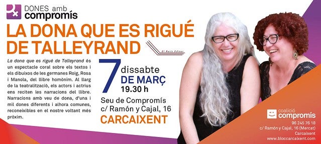-Carcaixent: “La dona que es rigué de Talleyrand” a càrrec de les germanes Roig, Rosa i Manola. Serà a la seu de Compromís, carrer Ramón y Cajal, 16 el dissabte 7 a les 19:00 hores.