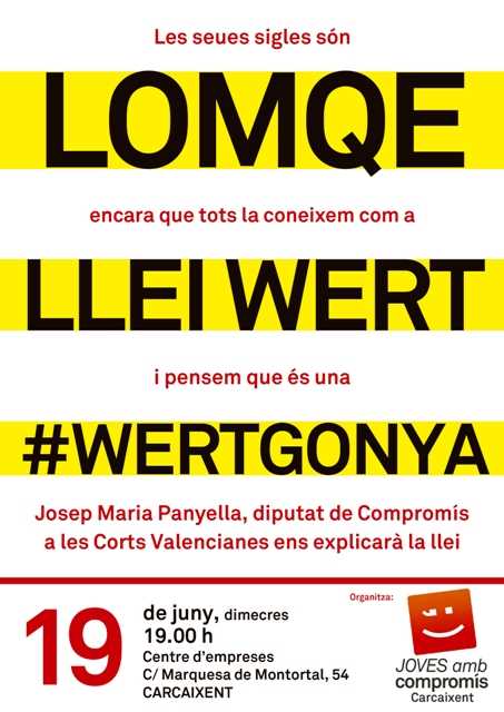 El projecte de Llei Orgànica de Millora de la Qualitat Educativa (LOMQE), més coneguda com a “Llei Wert”, du camí de ser la setena reforma de la democràcia en esta matèria. El Govern de l’Estat pretén aprovar-la amb la majoria absoluta que gaudeix el Grup Popular a les Corts. La reforma compta amb l’oposició de tots els sectors afectats (professors, alumnes, pares, etc.). Es tracta d’una nova imposició del PP, que afavoreix la privatització i la mercantilització del sistema educatiu.