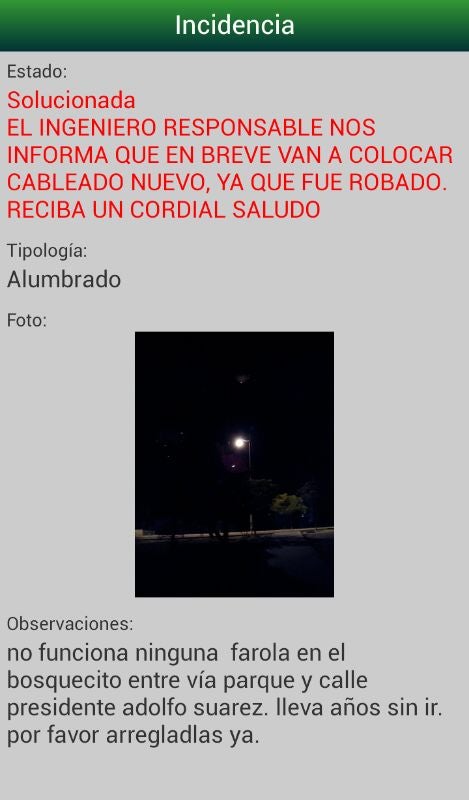 Concretament, la imatge correspon a un espai entre l’Avinguda Vicente Pérez Devesa i el carrer President Adolfo Suárez on de nit no hi ha cap il·luminació. El denunciant afirma que fa anys que no existeix cap llum a la zona, però l’Ajuntament contesta que els cables van ser robats i que “en breus” en col·locaran de nous. Cal dir que l’usuari va posar la denúncia mitjançant l’aplicació el passat mes de gener, que ja fa quasi 3 mesos de la resposta i que encara la zona està completament a fosques.