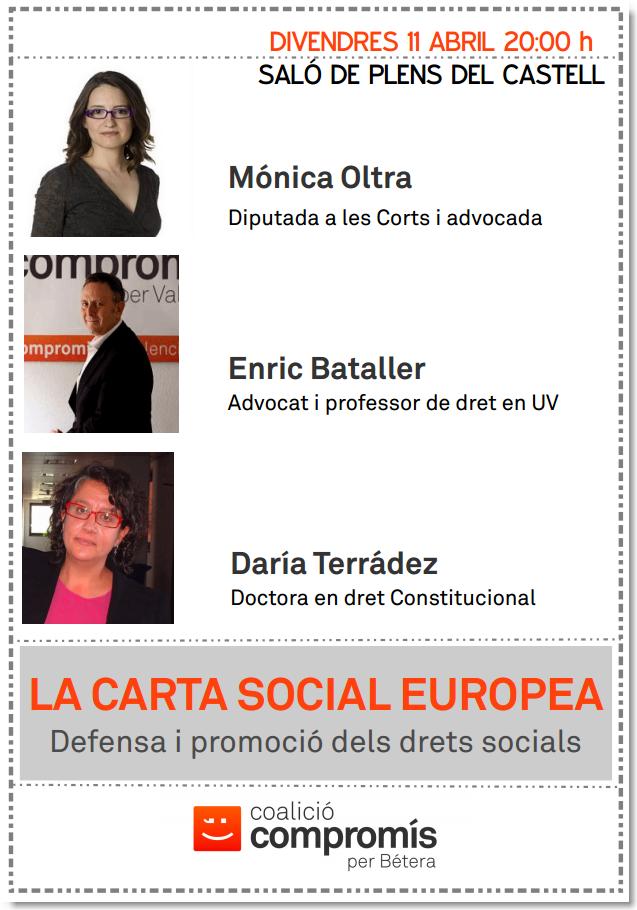 Mónica Oltra, diputada a les Corts Valencianes, Enric Bataller, professor de Dret en la Universitat de València, i la nostra companya del col·lectiu de Bétera Daría Terradéz, doctora en Dret Costitucional, participaran divendres que ve 11 d’abril a les 20.00h en la xarrada “LA CARTA SOCIAL EUROPEA: Defensa i promoció dels drets social” al saló de plens del Castell de Bétera.