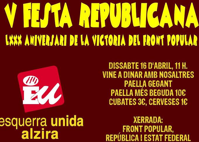 En commemoració de la República i el 80 aniversari en el que la unió de tota l’esquerra sota el Front Popular, deixà clara per mitjà d’unes eleccions lliures i democràtiques la voluntat de tota l’esquerra de dur a terme la transformació definitiva d’una societat injusta a una altra basada en la igualtat de les persones independentment de la seva condició.