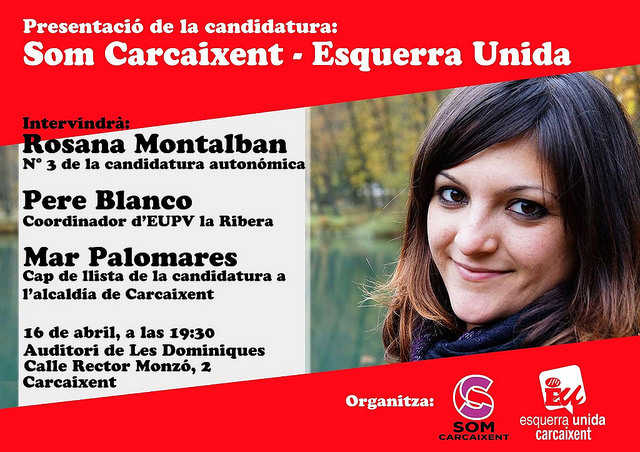 Mar Palomares, candidata a l’alcaldia d’EUPV-Carcaixent i membre del col·lectiu d’EUPV-Carcaixent: “Per primera vegada en molts anys tornem a estar presents a Carcaixent. Des d’EU fem una crida a la ciutadania perquè és l’hora de comprometre’s, de transformar la realitat i fer possible que hi haja una veu d’esquerres en les institucions.”