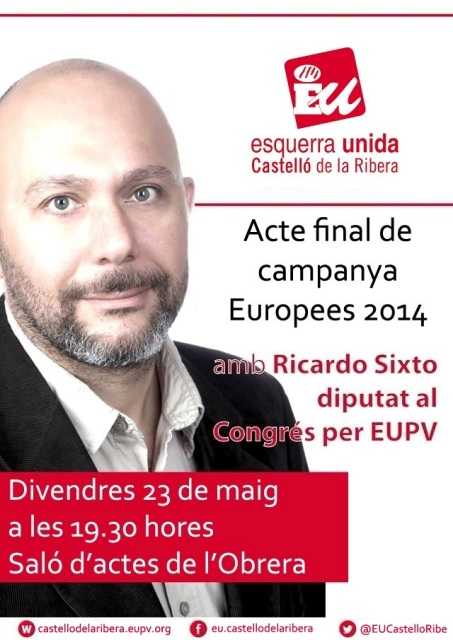 EU-Castelló de la Ribera celebra l’acte de final de campanya comarcal aquest divendres a les 19:30 h. al Saló d’Actes de l’Obrera amb Ricardo Sixto, diputat al Congrés per EUPV i Otilia Ferrando regidora i portaveu d’EUPV en l’Ajuntament de Castelló de la Ribera.
