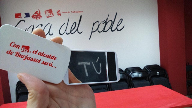 EU Burjassot es declara al poble, com Tirant amb Carmesina, amb espills. Espills en forma de caixa amb la inscripció “Amb Esquerra Unida, l’alcalde serà…” que, en obrir-se, mostren el reflex del veí o veïna.