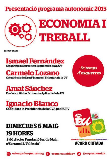 El candidat d’EUPV a la Presidència de la Generalitat, Ignacio Blanco, presenta hui en el Saló d’Actes de la Fundació 1er de Maig el programa sobre Economia i Ocupació, junt al candidat autonòmic de la formació d’esquerres i coordinador de l’àrea d’Economia d’EUPV, José Soler, i els professors Ismael Fernández, Carmelo Lozano i Amat Sánchez. “Tenim el millor programa per a abordar els problemes reals que pateixen els valencians i valencianes amb l’objectiu de millorar les seues condicions de vida i de treball, i a més un magnífic equip econòmic com a garantia per al canvi d’esquerres que es produirà el 24M”, explica Blanco.