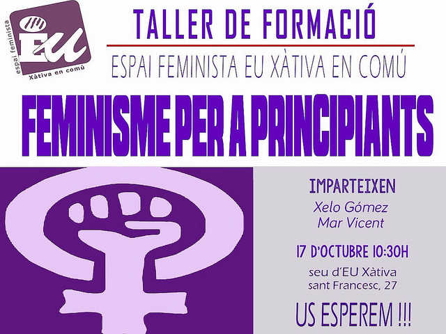 Des de l’Espai Feminista d’Esquerra Unida Xàtiva en Comú s’ha organitzat un taller formatiu sobre feminisme per aquest dissabte17 d’octubre. El taller estarà impartit per Xelo Gómez i Mar Vicent i tractarà sobre els aspectes fonamentals del concepte de feminisme.