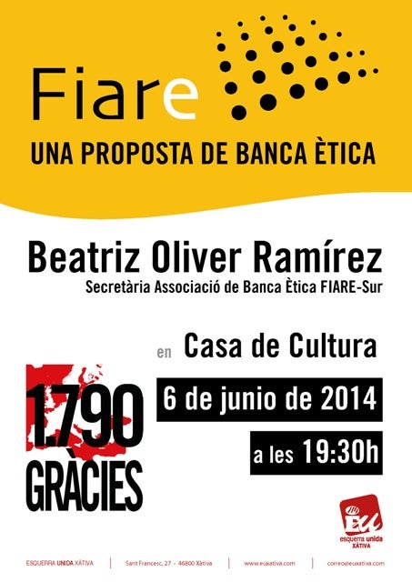 Presentació de FIARE divendres, dia 6 de juny a les 19.30 hores, a la Casa de Cultura de Xàtiva.