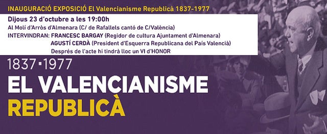 Inauguració de l’exposició “El Valencianisme Republicà 1837-1977” de la Fundació Josep Irla que tindrà lloc el pròxim dijous 23 d’octubre a les 19:00h al Molí d’Arròs d’Almenara.