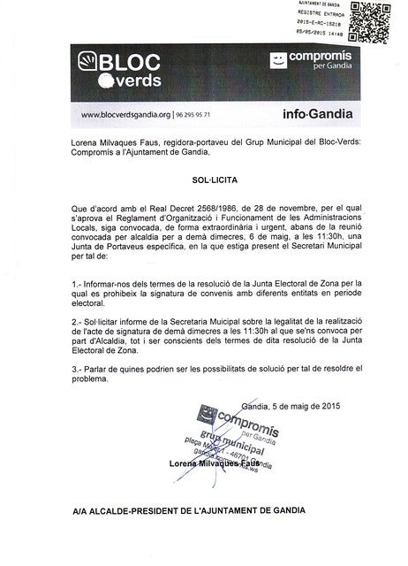 La portaveu de Compromís a l’Ajuntament de Gandia, Lorena Milvaques, ha registrat hui la sol·licitud de convocatòria d’una Junta de Portaveus, extraordinària i urgent, abans de la convocada per a demà dimecres a les 11.30 hores, amb la presència del Secretari Municipal de l’Ajuntament, per tal que s’informe dels termes de la resolució de la Junta Electoral de Zona per la qual es prohibeix la signatura de convenis amb diferents entitats en període electoral.