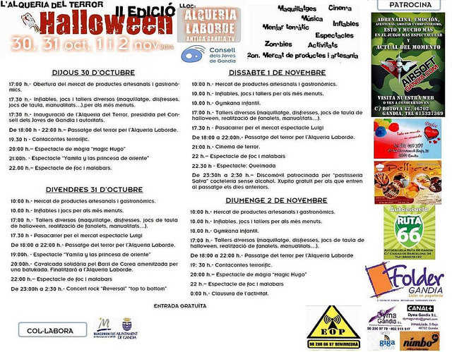 A banda d’activitats com tallers de manualitats, maquillatge, contacontes, cinema, teatre, concerts o discomòbil, cal destacar el passatge del terror que aquest any supera els 200 metres de longitud, situant-se així com el més llarg i sorprenent de la comarca de la Safor. També, com a novetat aquest any hi haurà una recreació de ciutat zoombie, espectacles de focs i malabars i màgia. També, i a l’igual que el passat any, a l’exterior de l’Alqueria Laborde hi haurà un mercat d’artesania i alimentació, així com d’atraccions per als més menuts durant tot el dia.