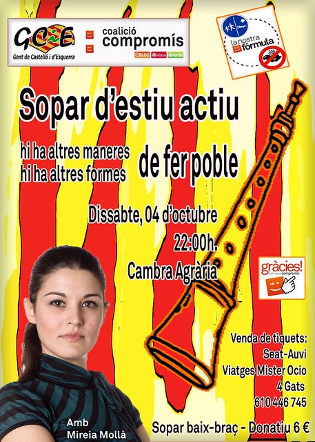 En aquesta ocasió deixarem que passen uns dies després de les festes del poble i farem l’acte i el sopar el dissabte 4 d’octubre al magatzem de la Cambra Agrària de Castelló. Per adquirir els tiquets –de sis (6) euros- cal anar als llocs habituals (tasca 4 Gats, Agència de viatges Mister Ocio o Seat-Auvi) o contactar amb qualsevol de les persones del col·lectiu.