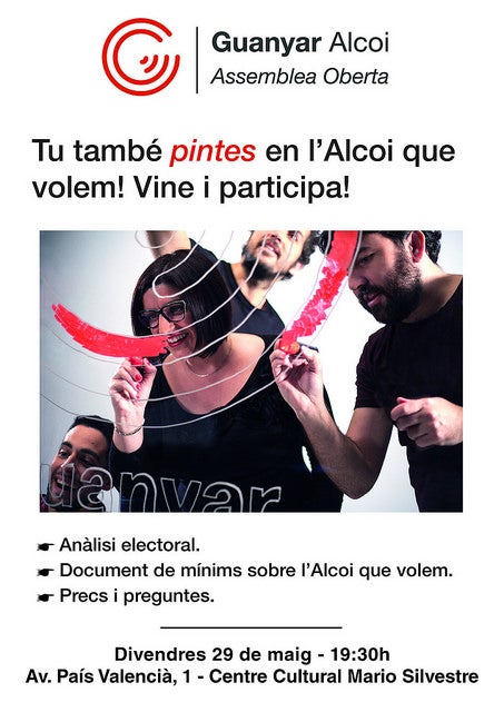 Fem una crida doncs, per a què acudisca a aquesta Assemblea el major nombre de gent possible. Necessitem construir un projecte sòlid, plural i fort, i cal del vostre suport i opinió per enfortir la unitat popular de Guanyar Alcoi.