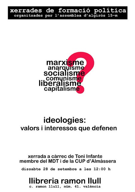 El proper dissabte 28 de setembre, la llibreria Ramon Llull de València, situada al carrer que té el mateix nom, al número 4, acollirà la xerrada que sota el títol “Ideologies: valors i interessos que defensen” forma part del cicle de xerrades sobre formació política que està impulsant l’Assemblea d’Algirós del 15-M.