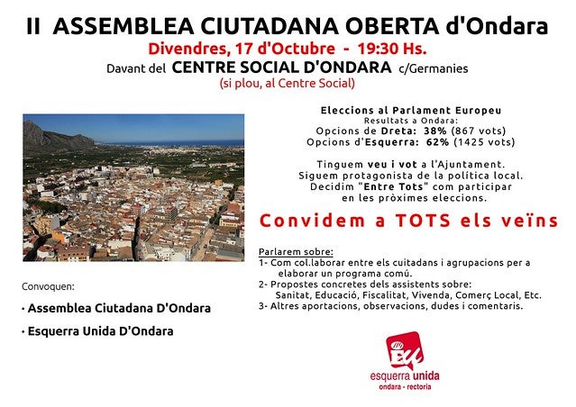 El nostre col.lectiu local va decidir convocar la II Assemblea Oberta d’Ondara per al 17 d’octubre a les 19.30h. davant del centre social d’Ondara, C/Germanies, en cas de mal temps tenim reservada la sala de l’última planta del mateix edifici públic.