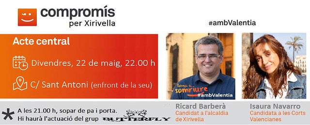 Aquest divendres 22 de maig, a partir de les 21 h, Compromís per Xirivella tancarà la campanya electoral amb una festa i sopar de pa i porta al carrer de Sant Antoni que inclourà l’actuació del grup de rock Butterfly i la intervenció d’Isaura Navarro, candidata de Compromís a les Corts Valencianes. En l’acte també intervindran Puri Botella, número dos de la candidatura de Compromís per Xirivella, i Josep M. Moret, número dos, a més del candidat a l’alcaldia, Ricard Barberà, i, per descomptat, tot el públic assistent que vulga dir la seua.