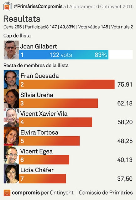 Per la seua banda, en les votacions per a llista, el regidor de Sostenibilitat i Medi Ambient Fran Quesada va obtenir 75’90 punts, Silvia Ureña 62’18, Vicent Xavier Vila, 58’20 , 48’25 Elvira Tortosa, 40’13 Vicent Egea i 37’50 Lídia Chàfer. En una votació on es votava ordenant per ordre de preferència als candidats, assignant així un valor 1/n.