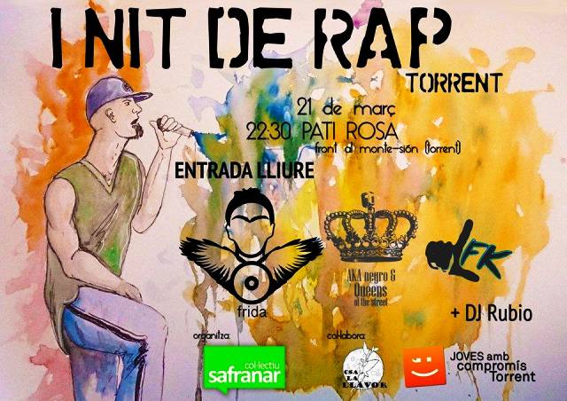 La I Nit de Rap tindrà lloc el proper divendres 21 de març al conegut com a Pati Rosa (al costat de l’Institut Tirant Lo Blanc i el Col·legi Mont-Sió i en l’enllaç entre els carrers de Fra Lluís Amigó i Pare Prudencio) i començarà a les 22.30h. El mateix dia, es clourà la votació del procés de primàries per a triar la llista de les eleccions europees de la Coalició Compromís, on Torrent tindrà una seu electoral en la qual podran participar tots els ciutadans que s’hi hagen apuntat i que no hagen votat prèviament per internet.