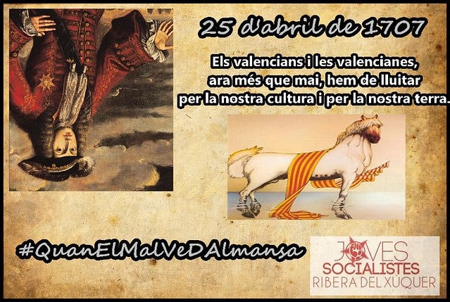 Avuí es compleix el 306 aniversari de la pèrdua de la Batalla dAlmansa en favor de les tropes de Felip de Borbó i, també, la pèrdua de les nostres lleis i furs de la nostra terra en favor del centralisme borbònic. Per això, volem recordar aquest dia amb força que els valencians i les valencianes amb les nostres senyes didentitat han de reivindicar-se arreu de l’Estat Espanyol, d’Europa i del món les nostres reivindicacions pròpies com a poble. Hem llançat una campanya arreu de les xarxes socials per a plasmar aquesta idea tan important i que ha de passar generació per generació.