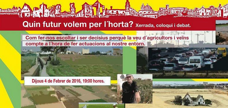 S’hi comptarà amb la participació de Jordi Belver, llaurador de Castellar, membre de Per l’Horta, de la CUP de València i de Poble Lliure, Vicent Martí, agricultor ecològic d’Alboraia i un referent de l’ecologia i del compromís per a tota la gent que estima l’Horta i de Laura Ferris, fundadora del projecte educatiu Horta Verda i veïna d’Almàssera. L’acte abordarà el futur de l’horta, a una comarca (L’Horta Nord) que durant els últims anys ha perdut gran part del seu territori agrícola.