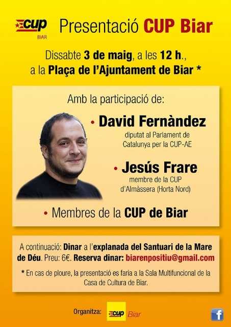 Des de la CUP de Biar també s’ha realitzat diversos comunicats, amb motiu de l’aprovació dels Pressupostos Municipals, on reclamaven uns Pressupostos participatius, altre comunicat pel que fa a la reobertura del servei d’urgències 24 h., o pel que fa a donar la seua posició sobre la reforma de la llei d’interrupció voluntària de l’embaràs. Actualment el col·lectiu local intenta organitzar una Assemblea d’Aturats i aturades, sobre la que ja es va fer un acte públic el passat 21 de març, “tot sense deixar altre treball de banda”, segons els seus responsables.