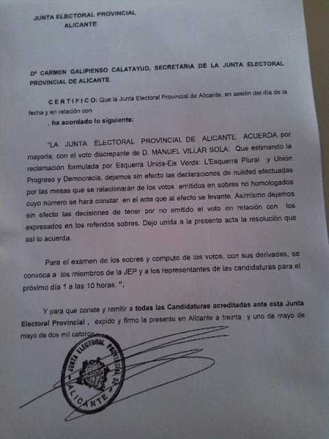 El portaveu adjunt d’Esquerra Unida en les Corts Valencianes, Lluís Torró, va declarar el passat dia 1 de juny que la resolució de la Junta Electoral d’Alacant que dóna validesa als vots nuls dins de sobres lleugerament diferents és un triomf per a la democràcia i esperem que siga un precedent que seguisquen les demés juntes electorals del País Valencià per a frenar l’intent antidemocràtic de PSOE i PP de callar o silenciar una part important de l’electorat”. “Ens felicitem sobretot pel treball dels nostres apoderats i dels nostres interventors, gràcies als quals s’han pogut fer les reclamacions i hem pogut guanyar aquest recurs”, ha afegit Torró.
