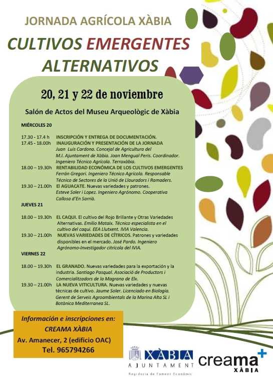 Xàbia. Dimecres, 13 de novembre de 2013. La Regidoria de Foment Econòmic de l’Ajuntament de Xàbia, en col·laboració amb el Creama, oferirà la setmana vinent un taller formatiu sobre agricultura i els nous cultius. Serà les vesprades del dimecres 20 al divendres 22 de novembre, de 18 a 21 hores, per la qual cosa tindrà una durada total de 9 hores.