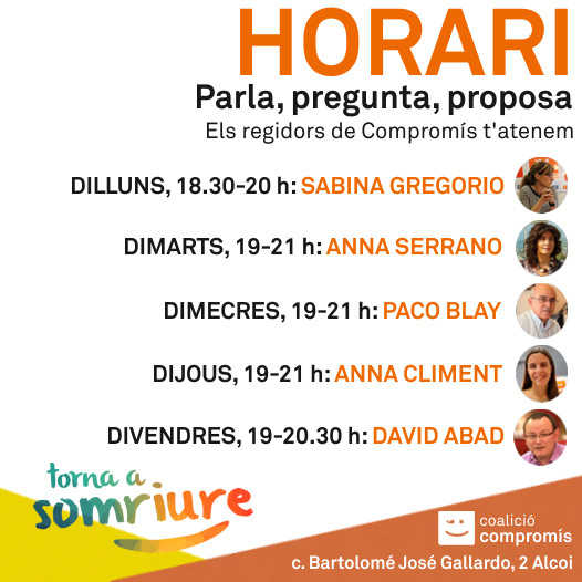 Com que estem en procés d’arreplegar propostes i idees per al programa, esta setmana cada dia hi haurà un regidor disponible per rebre els suggeriments, amb l’horari que marquem.