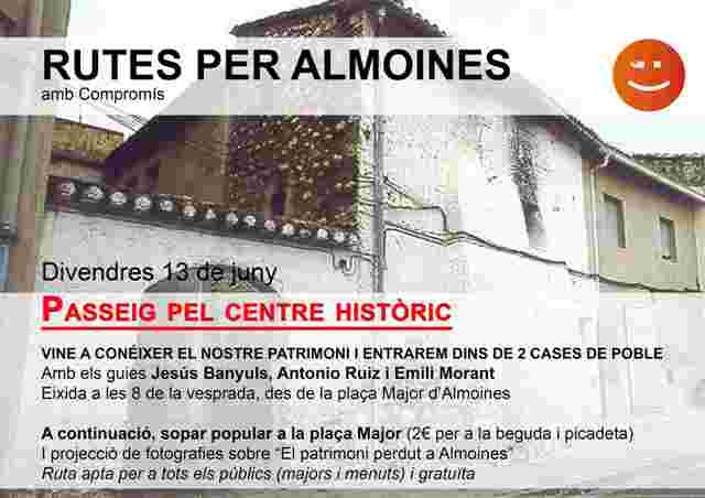 Compromís per Almoines manté la realització de la ruta històrica pel centre, el sopar popular a la plaça i la projecció d’una imatges sobre el patrimoni perdut del municipi. I fa una crida pública perquè participe massivament tot el veïnat.