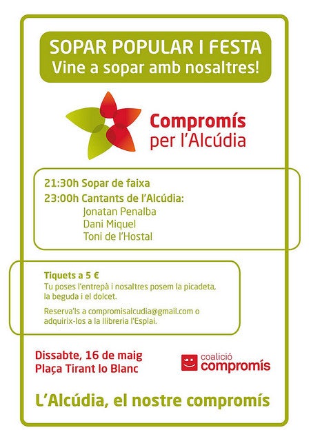 En acabar el sopar i abans de les actuacions prendran la paraula Graciela Ferrer, pròxima diputada, candidata número 3 a les Corts Valencianes per Compromís i finalment Paco Sanz, candidat a l’alcaldia, que presentarà algunes de les mesures que Compromís aplicarà durant el primer any de legislatura si els veïns i veïnes de l’Alcúdia li donen la confiança.