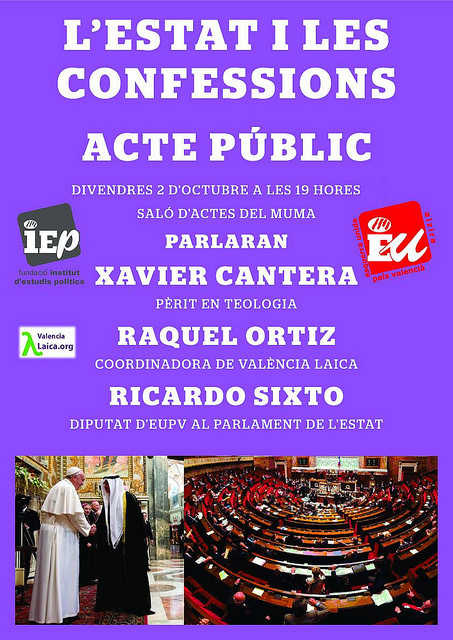 L’acte va ser presentat per Ivan Martínez, regidor per EU en l’Ajuntament d’Alzira, i van participar com a ponents: Xavier Cantera, pèrit en Teologia, Raquel Ortiz, presidenta de València Laica, i Ricardo Sixto, Diputat en el Congrés per EUPV.
