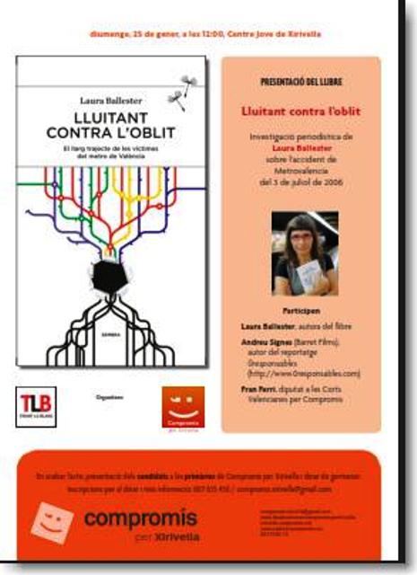 Diumenge 25 de gener a les 12 hores al Centre Jove de Xirivella (C/ Llevant UD, 2, vora el parc Clara Campoamor) tindrà lloc la presentació de Lluitant contra l’oblit, el llibre que explica un dels capítols més foscos de la nostra història recent. El 3 de juliol de 2006, el subsòl de València vivia el pitjor accident de metro de la història de l’Estat espanyol. A les vies de l’estació de Jesús, hi quedaren 43 persones mortes, 47 ferides de gravetat i les esperances trencades de centenars de famílies. A la superfície, els representants institucionals, i entre ells, Juan Cotino, s’afanyaven a passar pàgina i a tractar d’amagar la veritat. Lluitant contra l’oblit, el llibre que es presenta a Xirivella, és el relat necessari de la llarga lluita per rescatar-la.