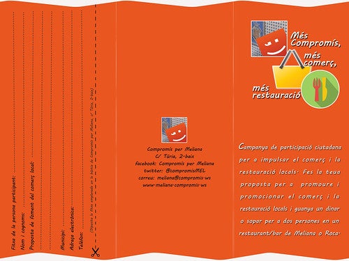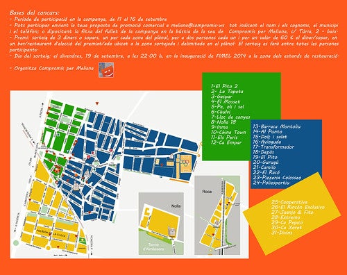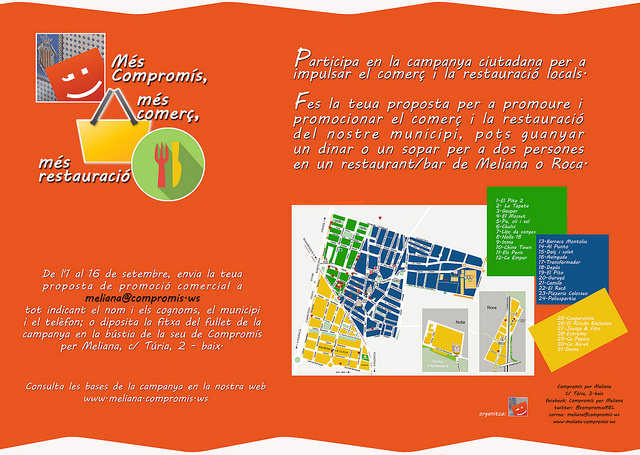 Per a Josep Riera, portaveu de Compromís, “es tracta que qualsevol persona puga fer una proposta de promoció del comerç i de la restauració de Meliana i participe en un sorteig de tres dinars o sopars en un restaurant/bar de Meliana”. Se’n sortejarà un per cada una de les zones amb què s’ha dividit el municipi i les persones guanyadores podran triar entre els locals que hi ha en cada zona. El dinar/sopar s’ha valorat en 60 € cada un per a dos persones.