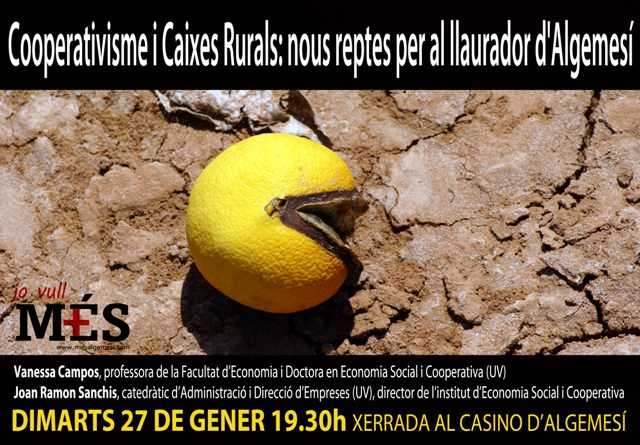 Per explicar-ho M+S ALGEMESÍ portarà a Vanessa Campos,Doctora en Economia Social i Cooperativa i professora de la Facultat d’Economia de la Universitat de València. La professora Campos, que en l’actualitat es troba immersa en el procés de primàries de la Coalició COMPROMÍS, és una especialista en cooperatives agroalimentàries reconeguda a nivell europeu sent l’única valenciana que va participar en l’elaboració de l’informe de la Comissió Europea “Support for farmers’ cooperatives” que va formar part de la documentació de treball sobre la qual es va fer la darrera reforma de la PAC. Vanessa Campos ens explicarà i concretarà què pot significar per a Algemesí i la seua cooperativa l’aplicació de la nova legislació i defensarà les virtuts del moviment cooperatiu, que ara es veu amenaçat per les maniobres del PP. Aposta per les cooperatives agroalimentàries i el comerç de proximitat com a base d’una economia social i emprenedora que permeta a Algemesí superar una crisi que no ha de castigar a la gent del camp ni a les classes treballadores.