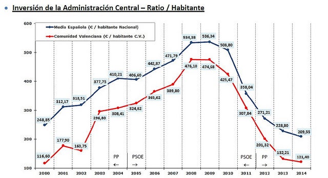 Ni un sol any, dels últims 16, les inversions de l’Estat han estat en la mitjana estatal. El pròxim any, per exemple, rebrem 155’4 euros per habitant, mentre que la mitja estatal serà de 241’5 euros, o siga cada valencià rebrà 86’1 euros menys que la mitja estatal, un 36% menys.