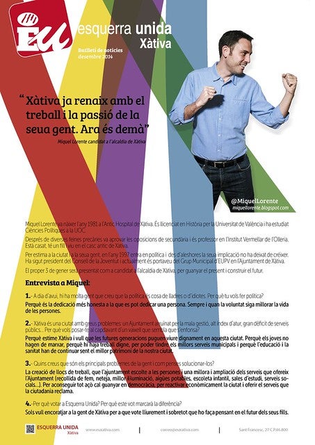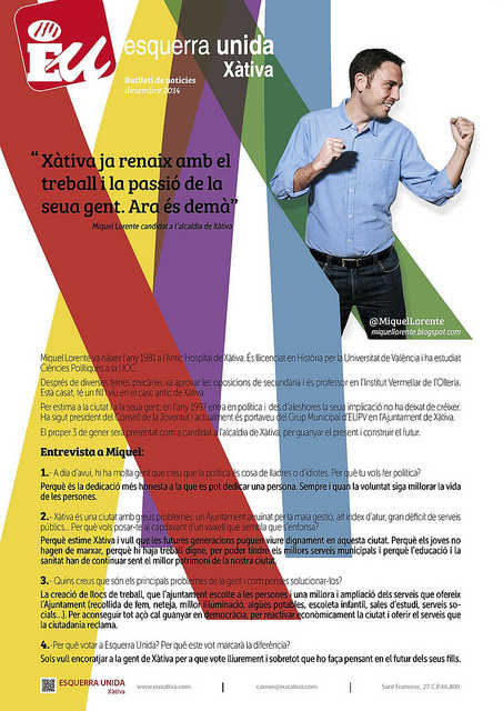 El col·lectiu d’EU durant els propers dies repartirà 3000 butlletins on es recull una entrevista al seu candidat, també s’informe sobre les conclusions dels econtres que ha tingut, durant els últims mesos, la formació amb els diferents sectors socials i econòmics de la ciutat. A més a més, des d’Esquerra Unida s’ha volgut informar de que el proper 3 de gener, dissabte, a les 12:00 en la plaça la Bassa tindrà lloc un acte públic on Ignacio Blanco, candidat d’EUPV a la presidència a la Generalitat, presentarà a Miquel Lorente com a candidat a l’alcaldia de Xàtiva. L’acte comptarà amb les actuacions musicals del grup Saba Nova i amb la intervenció de Pep Gimeno “Botifarra”.