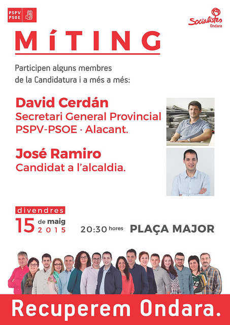 El proper divendres 15 de maig a les 20.30 hores, la Plaça Major d’Ondara acollirà el míting del PSPV-PSOE d’Ondara, al qual acudirà David Cerdán, Secretari General del partit a Alacant, com a introductor de l’acte i del candidat socialista a l’alcaldia José Ramiro. Aquest últim ha manifestat que no es tracta d’un acte únicament focalitzat en la figura del candidat, sinó també en els membres que conformen la candidatura, els quals intervindran igualment en el míting “per tal de demostrar que el projecte dels socialistes d’Ondara és un model horitzontal i plural, allunyat de jerarquies i estructures d’altres temps”. Ramiro ha incidit en el concepte d’horitzontalitat a l’hora d’explicar la iconografia de la campanya de 2015, basada en el lema Recuperem Ondara i representada per una panoràmica completa dels setze membres de la candidatura, alineats en un nivell de compromís comú.