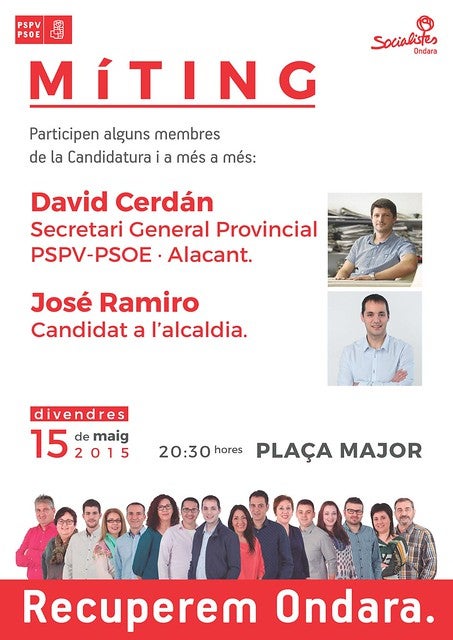 El proper divendres 15 de maig a les 20.30 hores, la Plaça Major d’Ondara acollirà el míting del PSPV-PSOE d’Ondara, al qual acudirà David Cerdán, Secretari General del partit a Alacant, com a introductor de l’acte i del candidat socialista a l’alcaldia José Ramiro. Aquest últim ha manifestat que no es tracta d’un acte únicament focalitzat en la figura del candidat, sinó també en els membres que conformen la candidatura, els quals intervindran igualment en el míting “per tal de demostrar que el projecte dels socialistes d’Ondara és un model horitzontal i plural, allunyat de jerarquies i estructures d’altres temps”. Ramiro ha incidit en el concepte d’horitzontalitat a l’hora d’explicar la iconografia de la campanya de 2015, basada en el lema Recuperem Ondara i representada per una panoràmica completa dels setze membres de la candidatura, alineats en un nivell de compromís comú.