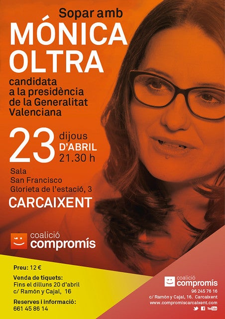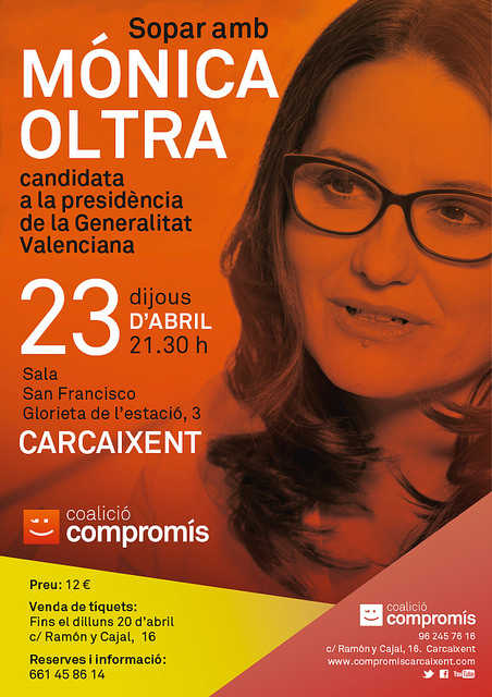Compromís per Carcaixent ha organitzat un sopar amb la candidata de la coalició a la presidència de la Generalitat, Mónica Oltra. Serà el pròxim dijous 23 d’abril, a partir de les 21.30 h, a la Sala San Francisco de Carcaixent.