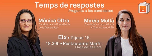 Les diputades de Compromís Mónica Oltra i Mireia Mollà han convocat demà una trobada amb la ciutadania d’Elx en la que explicaran les seues candidatures a les primàries de Compromís. Mónica Oltra opta a la Presidència de la Generalitat, mentre que Mireia Mollà es presenta a les primàries per a encapçalar la candidatura d’Elx i l’autonòmica.