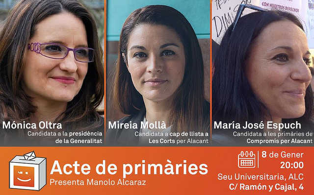 En el context de les primàries que està celebrant Compromís per a les pròximes eleccions autonòmiques, les candidates Mónica Oltra, Mireia Mollà i María José Espuch celebraran un acte obert dijous que ve 8 de gener a les 20 hores a la Seu Universitària a Alacant (carrer Ramon y Cajal 4) per a explicar les seues propostes i la seua candidatura.