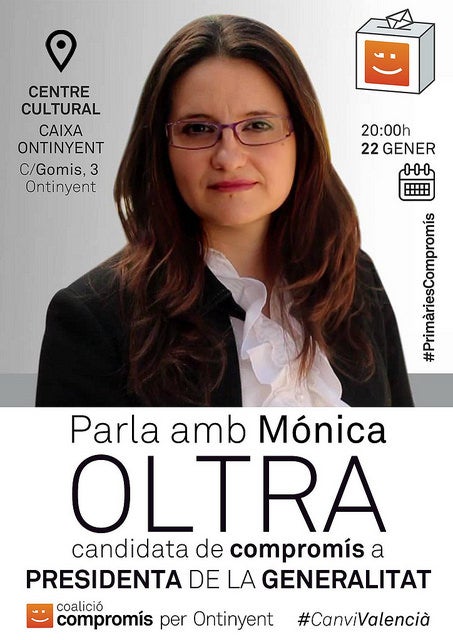 La diputada de Compromís a les Corts Valencianes, Mònica Oltra, estarà a Ontinyent per xerrar sobre “El canvi necessari al País Valencià i també a Ontinyent”. Mònica Oltra estarà acompanyada per diversos actors del món de la Cultura, de la Sanitat, de l’educació i la joventut. A més, el públic podrà intercanviar opinions i propostes amb Oltra. L’acte és obert a tota la ciutadania.